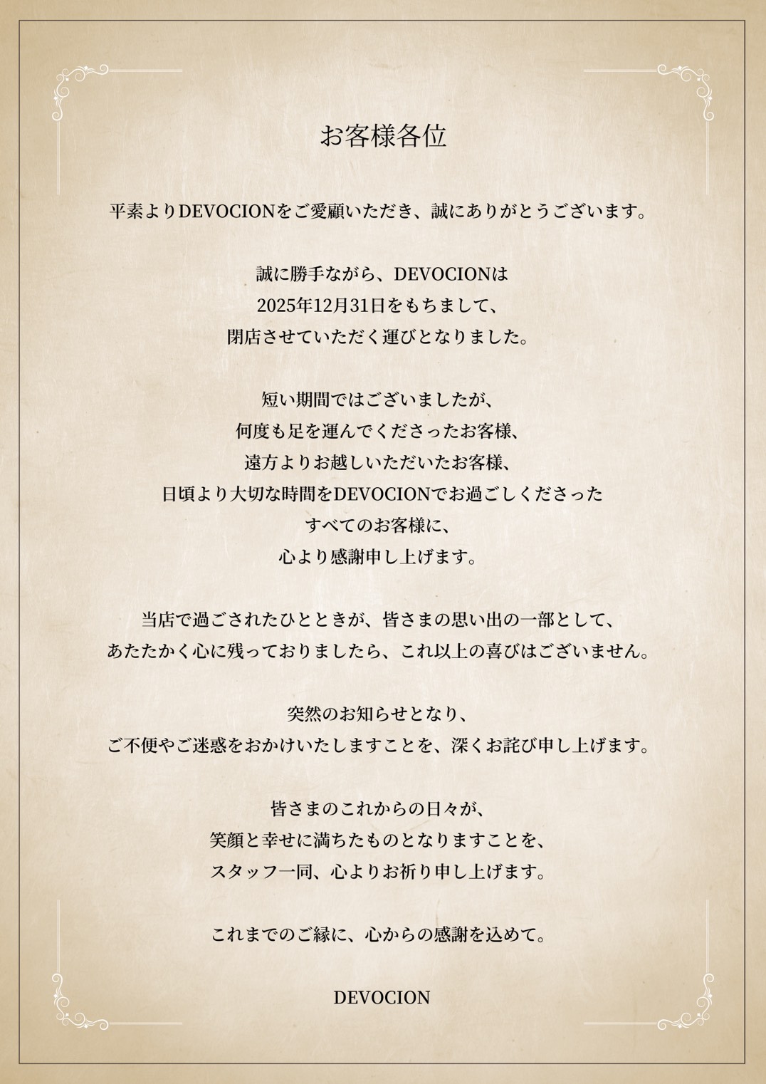 突然のお知らせとなりお客様にはご迷惑をおかけしてしまうこと深くお詫び申し上げます。 短い間でしたがありがとうございました。 -